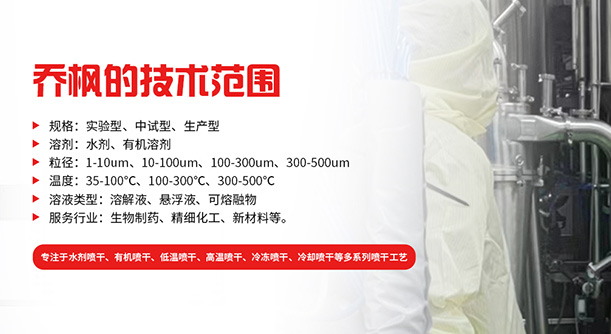 上海喬楓實業有限公司,成立于2012年,是從事噴霧干燥設備的研發設計、生產、銷售(小型噴霧干燥機實驗型噴霧干燥機35℃低溫噴霧干燥機,有機溶劑噴霧干燥機低溫閉式循環噴霧干燥機、超細粉末噴霧干燥機、噴霧冷凍干燥機真空噴霧干燥機、氣流噴霧干燥機,噴霧造粒干燥機,離心噴霧干燥機沸騰制粒機等)和售后于一體的綜合性公司,本公司現成為一家致力于為生物制藥、精細化工、新能源、陶瓷造粒及食品工程等領域提供全套解決方案的整線交鑰匙工程企業。